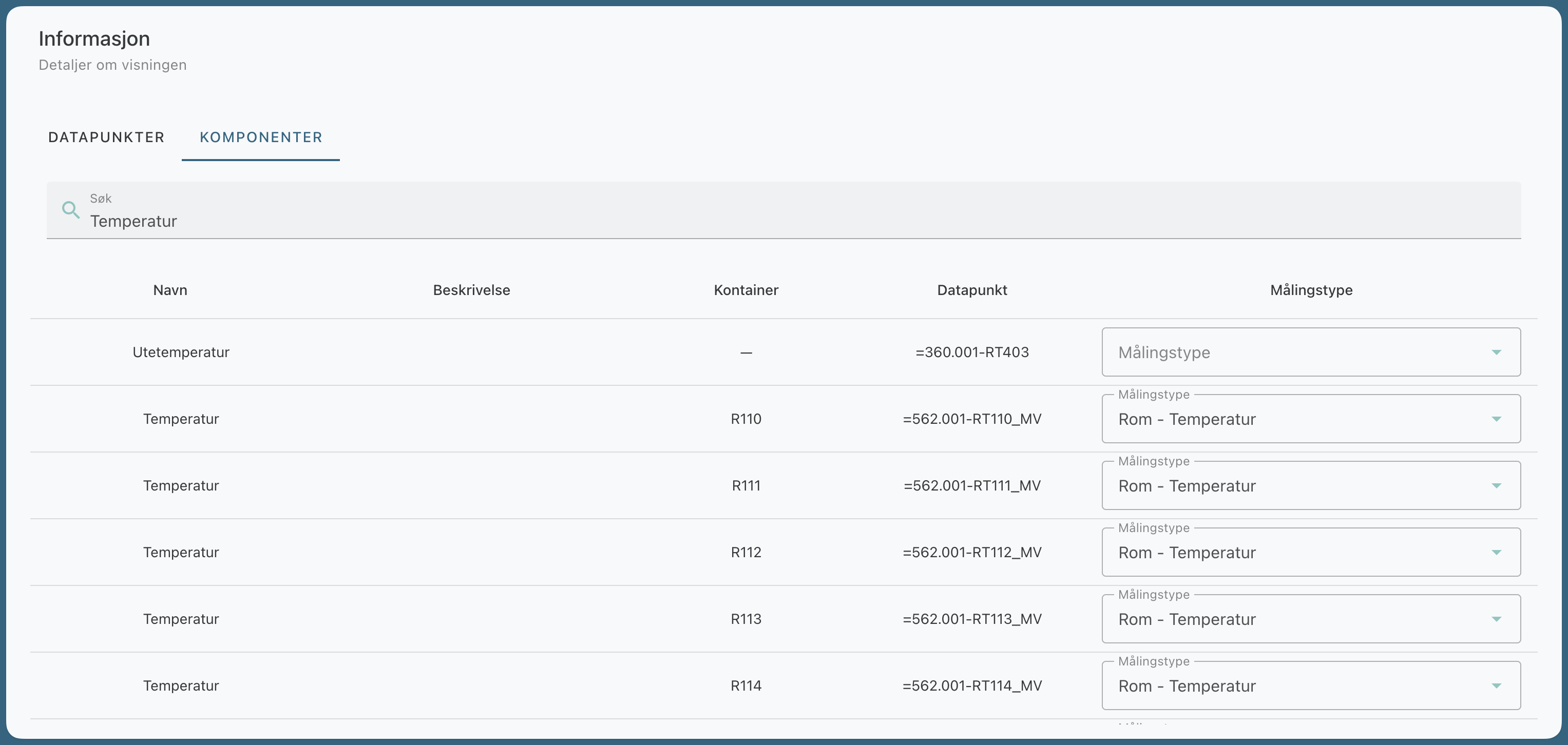 Rom - Temperatur vil gi systemet instrukser om at verdien fra denne komponenten/datapunktet skal vises i Dashboardets Inneklima-widget.