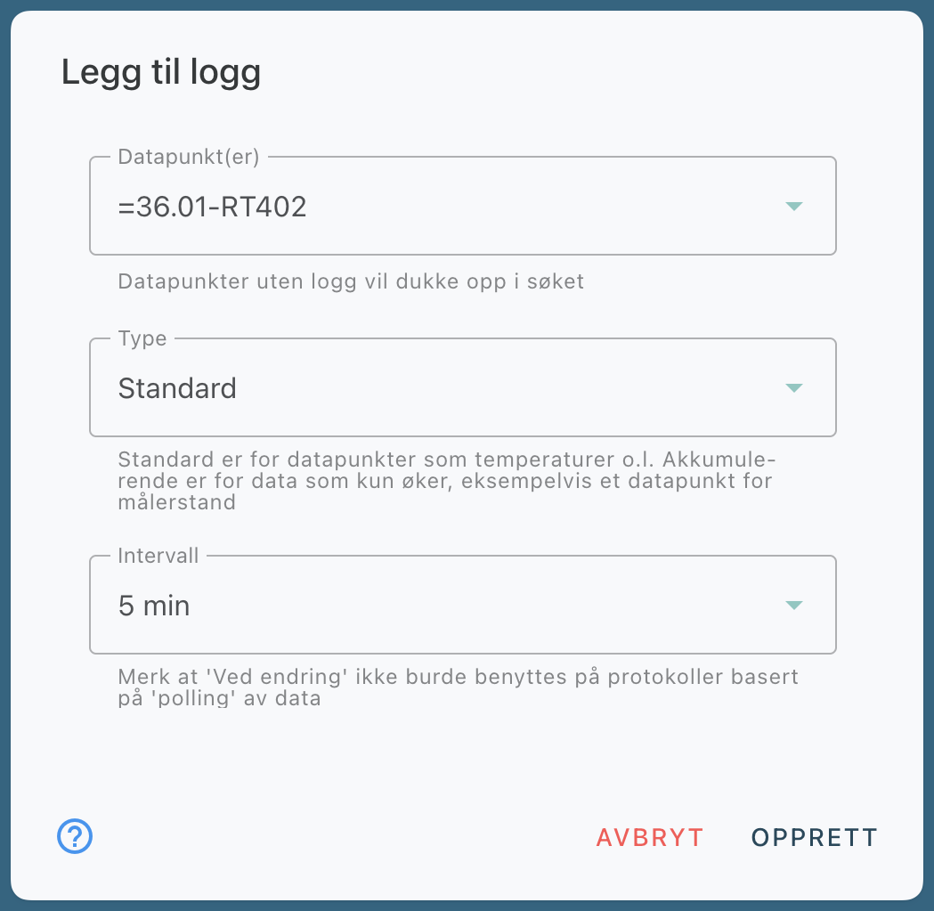 3. Velg hvilket datapunkt som skal logges, hvilken type og intervall for logging av data